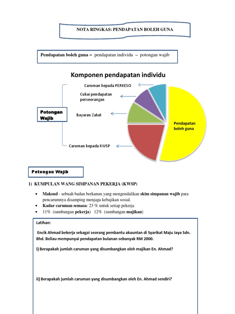 15 Questions Show answers. Maksud pendapatan boleh guna. 23 PENDAPATAN BOLEH GUNA Y d Maksud - Sejumlah pendapatan yang tinggal selepas mengambil kira potongan-potongan wajib Kumpulan Wang Simpanan Pekerja KWSP - satu bentuk simpanan wajib yang dilindungi oleh kerajaan - simpanan hari tua - semua pekerja diwajibkan mencarum kecuali - i kakitangan kerajaan yang telah memasuki skim pencen.